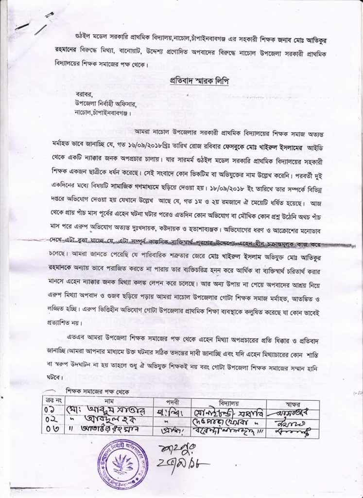 স্বারক লিপিতে নাচোল উপজেলার বিভিন্ন সরকারী প্রাইমারী বিদ্যালয়ের প্রায় ৭০ জন শিক্ষক তাদের সাক্ষর প্রদান করেছেন। সবাই এই সাজানো ঘটনার তীব্র প্রতিবাদ ও মিথ্যাচারের দৃষ্ঠান্তমূলক শাস্তির দাবী জানিয়েছেন।