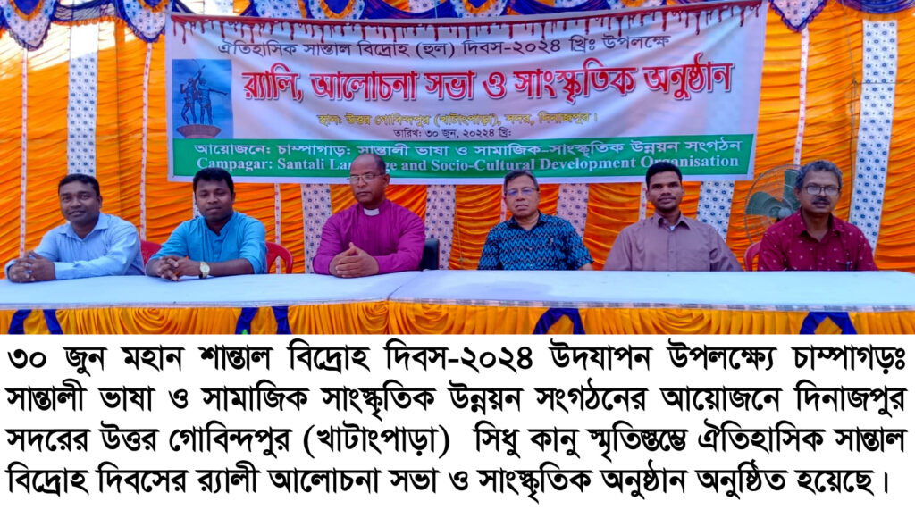 মোঃ নুর ইসলাম, দিনাজপুর থেকে ঃ গত ৩০ জুন মহান শান্তাল বিদ্রোহ দিবস ২০২৪ উদযাপন উপলক্ষ্যে চাম্পাগড়ে সান্তালী ভাষা ও সামাজিক সাংস্কৃতিক উন্নয়ন সংগঠনের আয়োজনে দিনাজপুর সদরের উত্তর গোবিন্দপুর (খাটাংপাড়া) সিধু কানু স্মৃতিস্তম্ভে ঐতিহাসিক সান্তাল বিদ্রোহ দিবসের র্যালী আলোচনা সভা ও সাংস্কৃতিক অনুষ্ঠানের মধ্য দিয়ে সান্তাল বিদ্রোহ দিবসের সকল কর্মসূচি পালন করা হয়েছে। এ সকল কর্মসূচির মধ্যে সকাল ১০ টা ৩০ মিনিটে সিধু কানু স্মৃতিস্তম্ভে পুষ্প স্তবক অর্পণ শেষে এক বর্ণাঢ্য ্র্যালী এলাকার সড়ক প্রদক্ষিণ করে। সকাল ১১ টা ৩০ মিনিটে আলোচনা সভা এবং দুপুর ২ টা থেকে ৫ টা পর্যন্ত একটি মনোজ্ঞ সাংস্কৃতিক অনুষ্ঠান অনুষ্ঠিত হয়েছে।