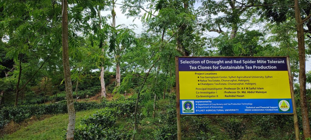 ড. সাইফুল বলন, “পাট শিল্প, চিনি শিল্প ইতামধ্য নিঃশষ হয় গছ, চা শিল্পর বিরুদ্ধও ষরয¿ চলছ। গ্রাম থক শহর আবালবদ্ধবনিতার প্রিয় পানীয় চা। বাংলাদশ দিনদিন এর চাহিদা বড়ছ কি উৎপাদন স অনুপাত বাড়নি। চাহিদার কথা মাথায় রখ সরকারক ২০১৫ সাল থক বাইরর দশ থক চা আমদানী করত হছ। এর অন্যতম প্রধান কারণ হলা, নভম্বর থক এপ্রিল পর্যÍ প্রায় ৫ মাস খরার সময় বাংলাদশ চা পাতা তালা যায় না। তাই সিলট কষি বিশ্ববিদ্যালয়র চা বাগান ড্রট টলারট ভ্যারাইটি বা খরা সহিষ্ণু চায়র জাত উ¢াবনর প্রক্রিয়া চলছ।” তিনি জানান, একজন পিএইডি ছাত্র তার সাথ বজ্ঞানিক গবষণা চালিয় যাছন। ইতামধ্য গবষক দলটি, দশ বিদশর বিভিন বাগানর সরা সরা চায়র চারা সংগ্রহ করছ। সচর পরিমান কমিয় প্রাকতিক পরিবশ চা গাছ টকানা যায় কি না, তা পরীক্ষা করা হছ। পাশাপাশি মাইট (পাতার রস খয় ফল এক ধরণর ক্ষুদ্র পাকা) এবং অন্যান্য পাকা চা পাতার কি কি ক্ষতি করছ সটা খতিয় দখা হছ এবং মাইট ও পাকা সহিষ্ণু চায়র জাত উ¢াবনর চষ্টা চলছ।
