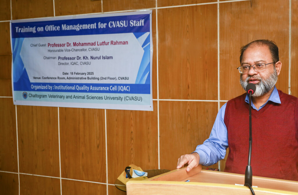 চট্টগ্রাম ভেটেরিনারি ও এনিম্যাল সাইন্সেস বিশ্ববিদ্যালয়ের (সিভাসু) কর্মচারীদের জন্য ‘অফিস ব্যবস্থাপনা’ বিষয়ে দিনব্যাপী এক প্রশিক্ষণ কর্মশালার আয়োজন করা হয়েছে। গত ১৮ ফেব্রুয়ারি মঙ্গলবার বিশ্ববিদ্যালয়ের ইনস্টিটিউশনাল কোয়ালিটি অ্যাসুরেন্স সেল (আইকিউএসি) এ প্রশিক্ষণ কর্মশালার আয়োজন করে। বিশ্ববিদ্যালয়ের প্রশাসনিক ভবনের সম্মেলনকক্ষে আয়োজিত ‘অফিস ব্যবস্থাপনা’ বিষয়ক উক্ত প্রশিক্ষণ কর্মশালার উদ্বোধনী অনুষ্ঠানে প্রধান অতিথি হিসেবে উপস্থিত ছিলেন উপাচার্য প্রফেসর ড. মোহাম্মদ লুৎফুর রহমান।